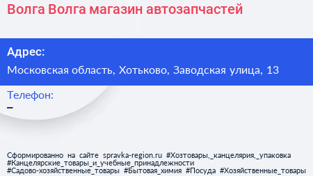 Волга-Волга, магазин автозапчастей по адресу Московская область, Хотьково, Заводская улица, 13 в дальнейшем Организация, размещена в следующих категориях: