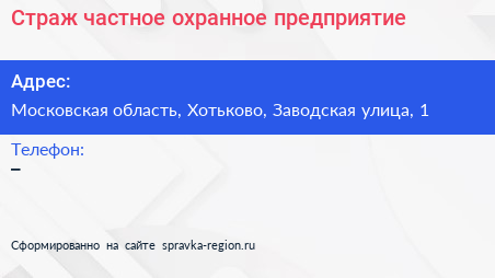 Страж, частное охранное предприятие по адресу Московская область, Хотьково, Заводская улица, 1 в дальнейшем Организация, размещена в следующих категориях: