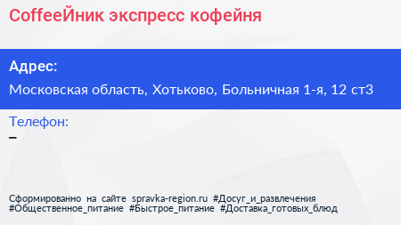 CoffeeЙник, экспресс-кофейня по адресу Московская область, Хотьково, Больничная 1-я, 12 ст3 в дальнейшем Организация, размещена в следующих категориях: