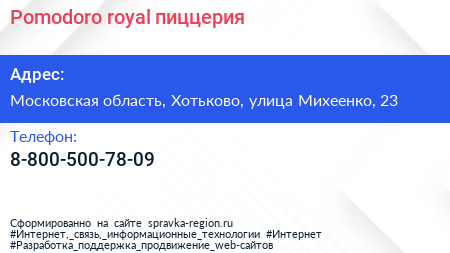 Pomodoro royal, пиццерия по адресу Московская область, Хотьково, улица Михеенко, 23 в дальнейшем Организация, размещена в следующих категориях: