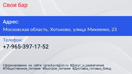 Свои, бар по адресу Московская область, Хотьково, улица Михеенко, 23 в дальнейшем Организация, размещена в следующих категориях: