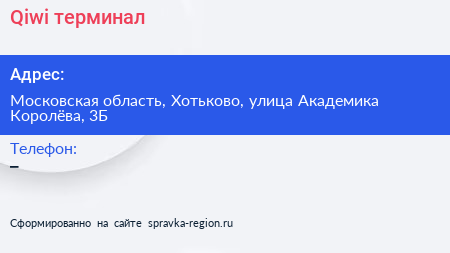 Qiwi, терминал по адресу Московская область, Хотьково, улица Академика Королёва, 3Б в дальнейшем Организация, размещена в следующих категориях: