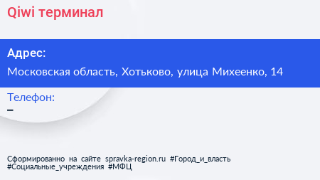 Qiwi, терминал по адресу Московская область, Хотьково, улица Михеенко, 14 в дальнейшем Организация, размещена в следующих категориях: