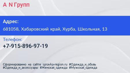 А & N Групп по адресу 681058, Хабаровский край, Хурба, Школьная, 13 в дальнейшем Организация, размещена в следующих категориях: