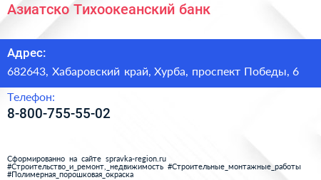 Азиатско-Тихоокеанский банк по адресу 682643, Хабаровский край, Хурба, проспект Победы, 6 в дальнейшем Организация, размещена в следующих категориях: