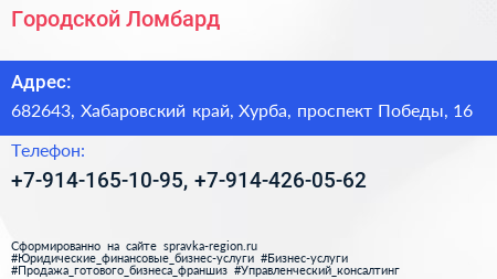 Городской Ломбард по адресу 682643, Хабаровский край, Хурба, проспект Победы, 16 в дальнейшем Организация, размещена в следующих категориях: