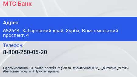 МТС-Банк по адресу 682644, Хабаровский край, Хурба, Комсомольский проспект, 4 в дальнейшем Организация, размещена в следующих категориях: