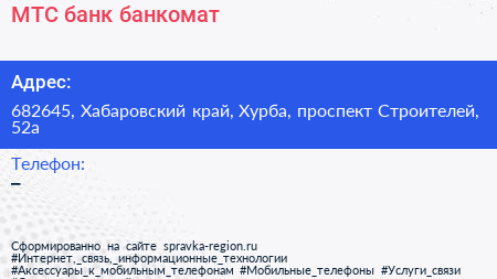 МТС банк, банкомат по адресу 682645, Хабаровский край, Хурба, проспект Строителей, 52а в дальнейшем Организация, размещена в следующих категориях: