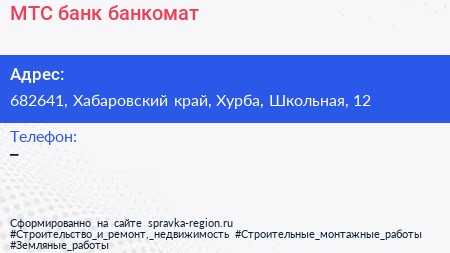 МТС банк, банкомат по адресу 682641, Хабаровский край, Хурба, Школьная, 12 в дальнейшем Организация, размещена в следующих категориях:
