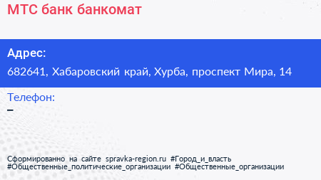 МТС банк, банкомат по адресу 682641, Хабаровский край, Хурба, проспект Мира, 14 в дальнейшем Организация, размещена в следующих категориях: