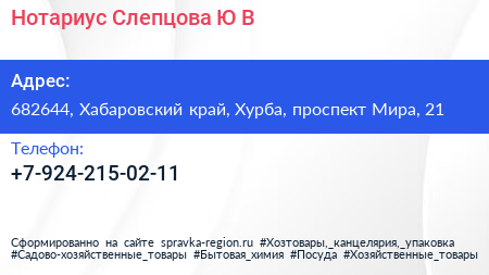 Нотариус Слепцова Ю.В. по адресу 682644, Хабаровский край, Хурба, проспект Мира, 21 в дальнейшем Организация, размещена в следующих категориях: