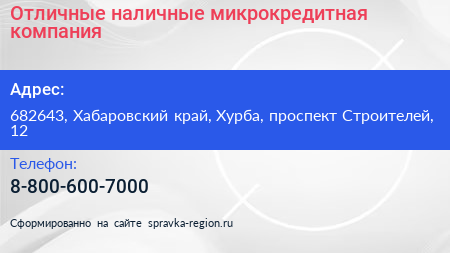 Отличные наличные, микрокредитная компания по адресу 682643, Хабаровский край, Хурба, проспект Строителей, 12 в дальнейшем Организация, размещена в следующих категориях: