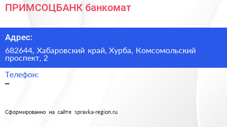 ПРИМСОЦБАНК, банкомат по адресу 682644, Хабаровский край, Хурба, Комсомольский проспект, 2 в дальнейшем Организация, размещена в следующих категориях: