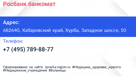 Росбанк, банкомат по адресу 682640, Хабаровский край, Хурба, Западное шоссе, 10 в дальнейшем Организация, размещена в следующих категориях: