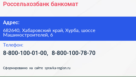 Россельхозбанк, банкомат по адресу 682640, Хабаровский край, Хурба, шоссе Машиностроителей, 6 в дальнейшем Организация, размещена в следующих категориях:
