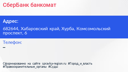 СберБанк, банкомат по адресу 682644, Хабаровский край, Хурба, Комсомольский проспект, 6 в дальнейшем Организация, размещена в следующих категориях: