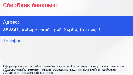 СберБанк, банкомат по адресу 682641, Хабаровский край, Хурба, Лесная, 1 в дальнейшем Организация, размещена в следующих категориях: