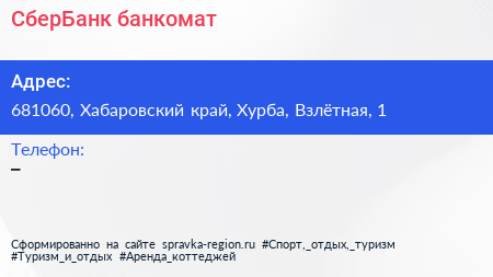 СберБанк, банкомат по адресу 681060, Хабаровский край, Хурба, Взлётная, 1 в дальнейшем Организация, размещена в следующих категориях: