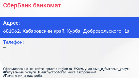СберБанк, банкомат по адресу 681062, Хабаровский край, Хурба, Добровольского, 1а в дальнейшем Организация, размещена в следующих категориях: