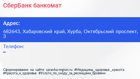 СберБанк, банкомат по адресу 682643, Хабаровский край, Хурба, Октябрьский проспект, 3 в дальнейшем Организация, размещена в следующих категориях:
