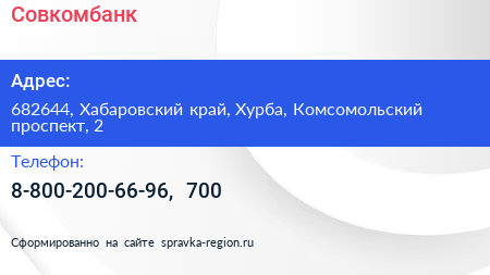 Совкомбанк по адресу 682644, Хабаровский край, Хурба, Комсомольский проспект, 2 в дальнейшем Организация, размещена в следующих категориях: