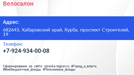 Велосалон по адресу 682643, Хабаровский край, Хурба, проспект Строителей, 19 в дальнейшем Организация, размещена в следующих категориях: