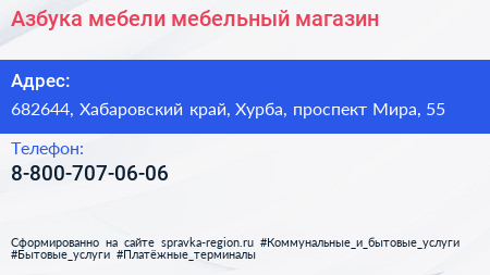 Азбука мебели, мебельный магазин по адресу 682644, Хабаровский край, Хурба, проспект Мира, 55 в дальнейшем Организация, размещена в следующих категориях: