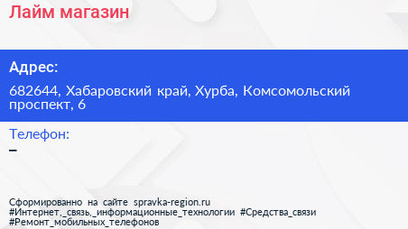 Лайм, магазин по адресу 682644, Хабаровский край, Хурба, Комсомольский проспект, 6 в дальнейшем Организация, размещена в следующих категориях: