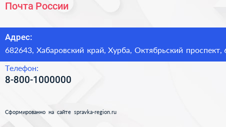 Почта России по адресу 682643, Хабаровский край, Хурба, Октябрьский проспект, 6 в дальнейшем Организация, размещена в следующих категориях: