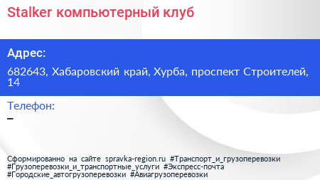 Stalker, компьютерный клуб по адресу 682643, Хабаровский край, Хурба, проспект Строителей, 14 в дальнейшем Организация, размещена в следующих категориях: