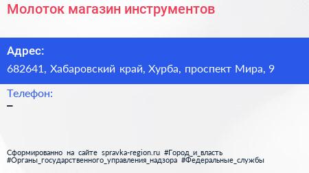Молоток, магазин инструментов по адресу 682641, Хабаровский край, Хурба, проспект Мира, 9 в дальнейшем Организация, размещена в следующих категориях: