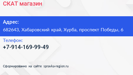 СКАТ, магазин по адресу 682643, Хабаровский край, Хурба, проспект Победы, 6 в дальнейшем Организация, размещена в следующих категориях:
