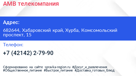 АМВ, телекомпания по адресу 682644, Хабаровский край, Хурба, Комсомольский проспект, 15 в дальнейшем Организация, размещена в следующих категориях:
