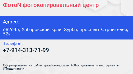ФотоN, фотокопировальный центр по адресу 682645, Хабаровский край, Хурба, проспект Строителей, 52а в дальнейшем Организация, размещена в следующих категориях: