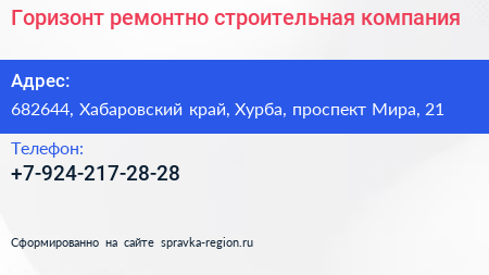Горизонт, ремонтно-строительная компания по адресу 682644, Хабаровский край, Хурба, проспект Мира, 21 в дальнейшем Организация, размещена в следующих категориях: