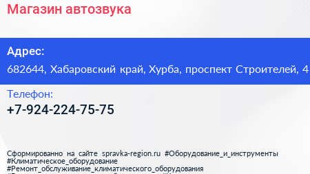 Магазин автозвука по адресу 682644, Хабаровский край, Хурба, проспект Строителей, 4 в дальнейшем Организация, размещена в следующих категориях: