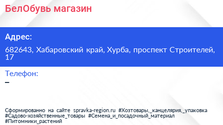 БелОбувь, магазин по адресу 682643, Хабаровский край, Хурба, проспект Строителей, 17 в дальнейшем Организация, размещена в следующих категориях: