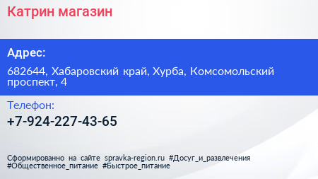 Катрин, магазин по адресу 682644, Хабаровский край, Хурба, Комсомольский проспект, 4 в дальнейшем Организация, размещена в следующих категориях: