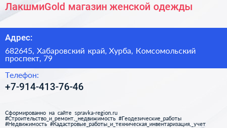 ЛакшмиGold, магазин женской одежды по адресу 682645, Хабаровский край, Хурба, Комсомольский проспект, 79 в дальнейшем Организация, размещена в следующих категориях: