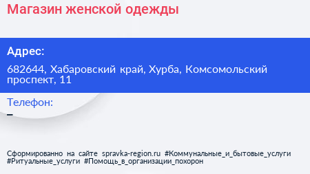 Магазин женской одежды по адресу 682644, Хабаровский край, Хурба, Комсомольский проспект, 11 в дальнейшем Организация, размещена в следующих категориях: