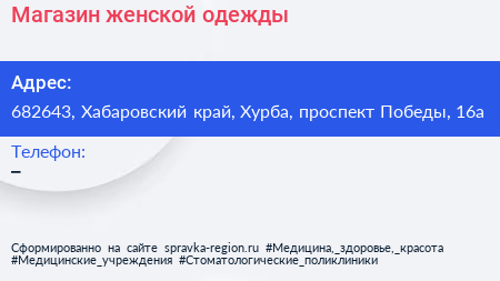 Магазин женской одежды по адресу 682643, Хабаровский край, Хурба, проспект Победы, 16а в дальнейшем Организация, размещена в следующих категориях: