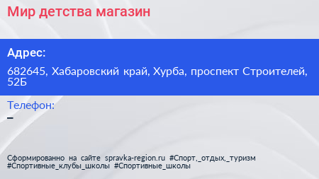 Мир детства, магазин по адресу 682645, Хабаровский край, Хурба, проспект Строителей, 52Б в дальнейшем Организация, размещена в следующих категориях: