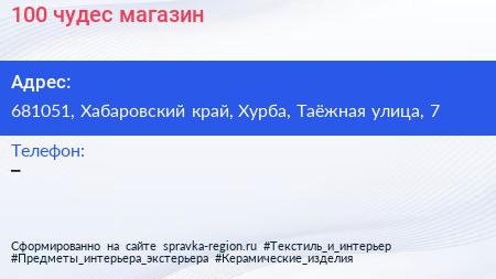 100 чудес, магазин по адресу 681051, Хабаровский край, Хурба, Таёжная улица, 7 в дальнейшем Организация, размещена в следующих категориях:
