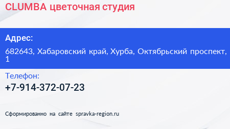 CLUMBA, цветочная студия по адресу 682643, Хабаровский край, Хурба, Октябрьский проспект, 1 в дальнейшем Организация, размещена в следующих категориях: