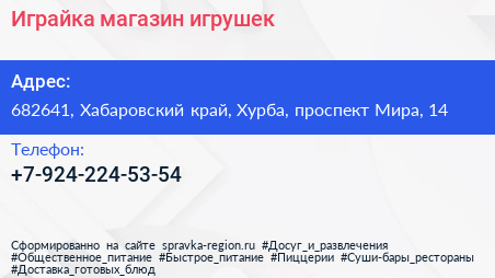 Играйка, магазин игрушек по адресу 682641, Хабаровский край, Хурба, проспект Мира, 14 в дальнейшем Организация, размещена в следующих категориях:
