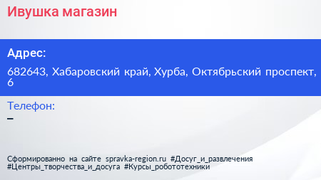 Ивушка, магазин по адресу 682643, Хабаровский край, Хурба, Октябрьский проспект, 6 в дальнейшем Организация, размещена в следующих категориях: