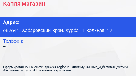 Капля, магазин по адресу 682641, Хабаровский край, Хурба, Школьная, 12 в дальнейшем Организация, размещена в следующих категориях: