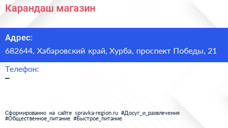 Карандаш, магазин по адресу 682644, Хабаровский край, Хурба, проспект Победы, 21 в дальнейшем Организация, размещена в следующих категориях: