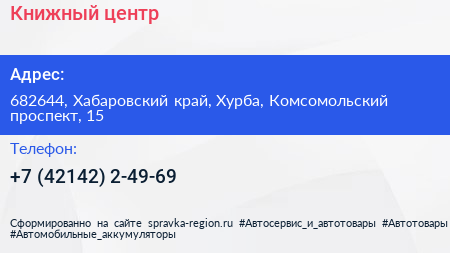 Книжный центр по адресу 682644, Хабаровский край, Хурба, Комсомольский проспект, 15 в дальнейшем Организация, размещена в следующих категориях: