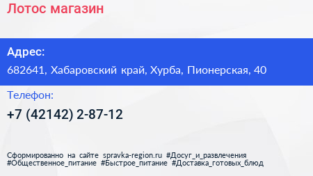 Лотос, магазин по адресу 682641, Хабаровский край, Хурба, Пионерская, 40 в дальнейшем Организация, размещена в следующих категориях: